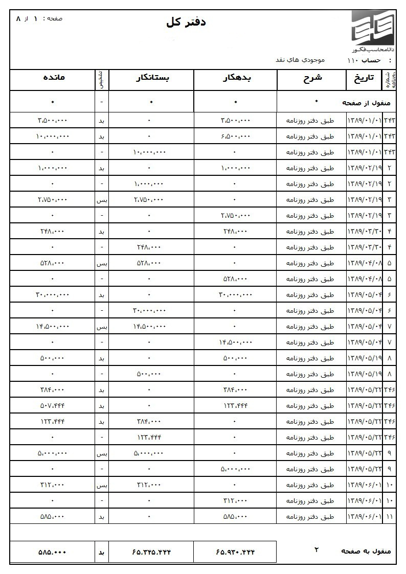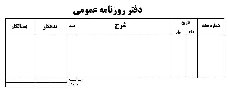 این دفتر دارای ستون هایی برای درج تاریخ و شرح رویدادهای مالی از لحاظ درآمد و هزینه می باشد.